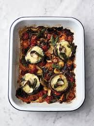 Peel the mushrooms, reserving the peel. Place it the mushrooms (peel included), tomatoes, sage and garlic in a 25cm x 30cm roasting tray and drizzle with 1 tablespoon each of olive oil and red wine vinegar. Add a pinch of sea salt and black pepper and toss together. Sit the mushrooms stalk side up. Bake for 10 minutes.